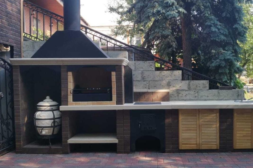 Мангал "BBQ64" с печью под казан разделочным столом и мойкой коричневый кирпич